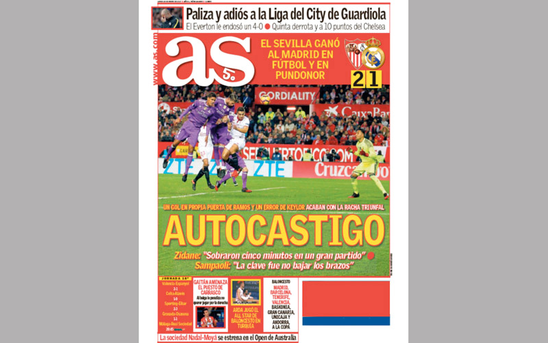 كتبت صحيفة «أس» الإسبانية على صدر صفحاتها أمس: «عقوبة ذاتية» في إشارة إلى تسجيل المدافع سيرجيو راموس هدفاً في مرماه، وخطأ ارتكبه كيلور، خلال مباراة الريال مع إشبيلية، وقالت الصحيفة: «فاز إشبيلية على مدريد، وزيدان يصف المباراة بالكبيرة، ويؤكد أن الفريق ترك اللقاء في الوقت القاتل».