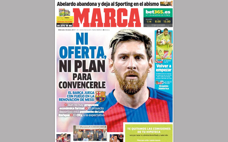 قالت صحيفة «ماركا» الإسبانية أمس، إن إدارة برشلونة تلعب بالنار في قضية تجديد عقد ليونيل ميسي الذي ينتهي صيف 2018، مشيرة إلى أن النادي الكاتالوني لم يقدم أي عرض جيد، ولم يضع أي خطة حقيقية للتعامل مع الوضع باستثناء تصريحات مثيرة للجدل.