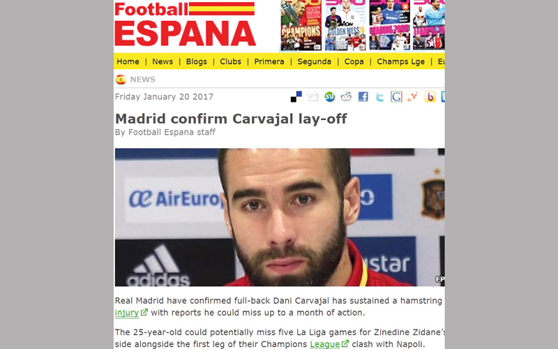 أكدت الفحوص التي خضع لها داني كارفخال غيابه عن فريقه ريال مدريد لنحو شهر بسبب إصابة عضلية، ما يعني أن اللاعب سيغيب عن خمس مباريات في الدوري الإسباني، وعن مباراة الذهاب في ثمن نهائي أبطال أوروبا أمام نابولي الإيطالي. «فووتبل إسبانيا»