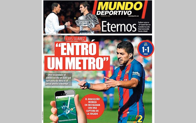 كتبت صحيفة «ألموندو» الكاتالونية على صدر صفحاتها أمس: «دخلت بمتر»، في إشارة لقرار الحكم الغريب بعدم احتساب هدف صحيح لبرشلونة في مرمى ريال بيتيس في المباراة التي انتهت 1-1 في الدوري الإسباني، أول من أمس، وقالت الصحيفة إن «كرة سواريز دخلت بأكملها للمرمى».