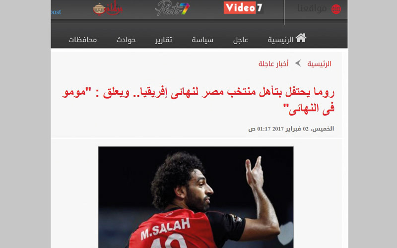 ذكرت صحيفة «اليوم السابع» المصرية، أمس، أن نادي روما احتفل بتأهل المنتخب المصري إلى نهائي كأس إفريقيا لكرة القدم، بعد التفوق على منتخب بوركينا فاسو بركلات الترجيح، حيث أشاد الموقع الإلكتروني لنادي روما بتألق محمد صلاح.
