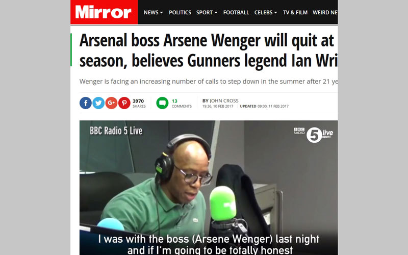 أشار النجم التاريخي السابق لأرسنال، أيان رايت، إلى أن مدرب الفريق الحالي، الفرنسي أرسين فينغر، أسرّ له خلال لقاء جمعهما بأنه بات قريباً من إنهاء مسيرته مع الفريق، الممتدة منذ 1996، خصوصاً في ظل الضغط الكبير على المدرب. «ميرور»