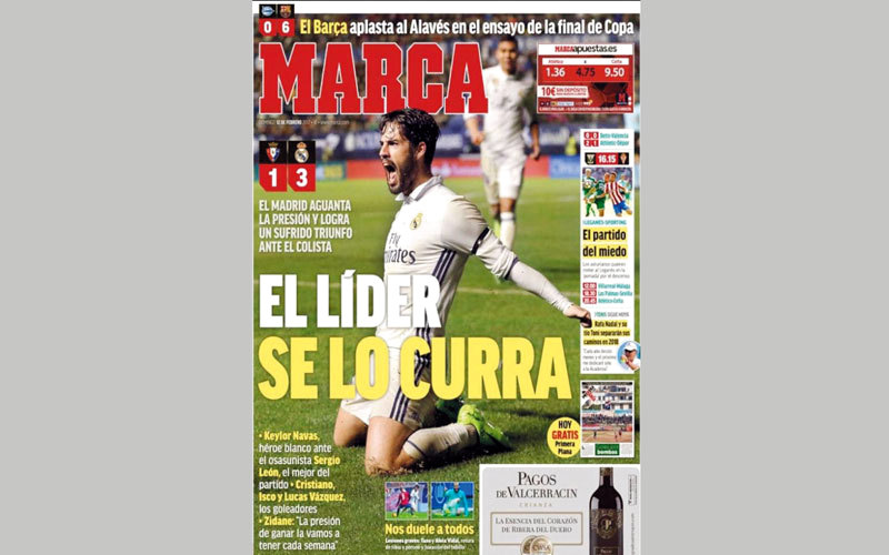 كتبت صحيفة «ماركا» على صدر صفحاتها أمس: «الزعيم»، في إشارة إلى النجم إيسكو الذي صال وجال في ملعب أوساسونا، وأحرز هدف التقدم 2-1 الذي فك شيفرة الخصم، ومنح ريال مدريد الفوز على أصحاب الأرض 3-1 في الدوري الإسباني.