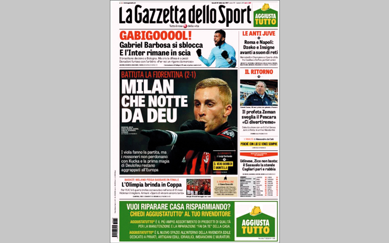عنونت صحيفة «لاغازيتا» الإيطالية غلافها أمس: «يا لها من ليلة ديو»، وقالت إن «جيرارد دولوفيو تألق في المباراة، وساعد ميلان على الفوز على حساب فيورنتينا 2-1، في الدوري الإيطالي». «لاغازيتا»