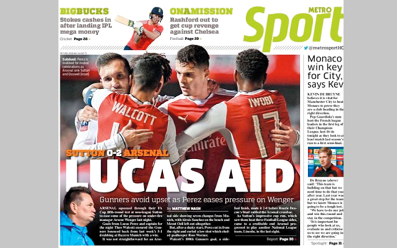 أسهم الإسباني لوكاس بيريز، في تخفيف الضغط الكبير عن كاهل مدربه الفرنسي أرسين فينغر، حين قاد أرسنال إلى الفوز على ساتون المتواضع في كأس الاتحاد الإنجليزي، وبلوغ دور ربع النهائي بعد أن سجل هدفاً، وأضاف زميله والكوت الثاني.«ميترو»