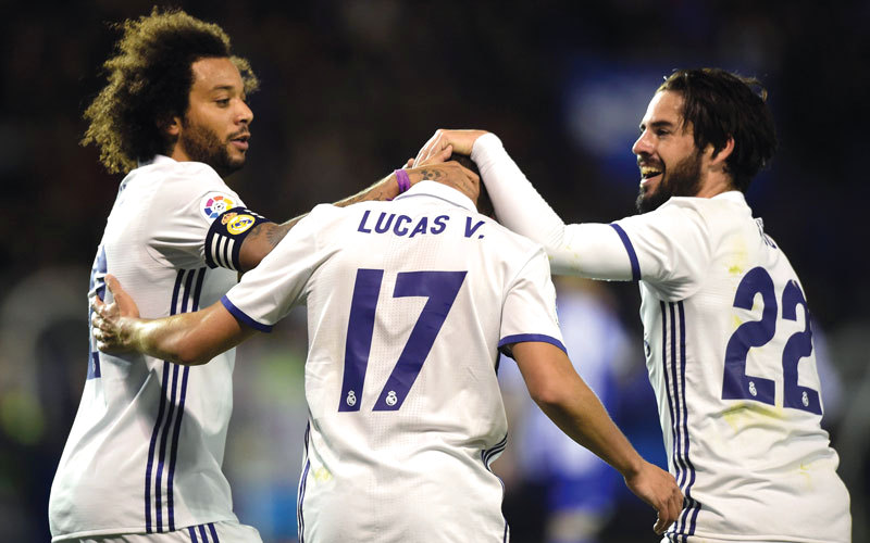 قال نجم فريق ريال مدريد، إيسكو، إن الملكي لديه «23 لاعباً أساسياً وليس هناك بدلاء»، في إشارة إلى قوة الفريق هذا الموسم، الذي يلعب بصفين مختلفين تقريباً في أوروبا وفي المسابقات الإسبانية، وبعد أن سحق الريال بتشكيلة مختلفة كلياً عن لقاء الكلاسيكو الأخير، مضيفه ديبورتيفو لاكورونيا، الذي سبق أن هزم برشلونة على نفس الملعب ريازور قبل أسابيع قليلة، حيث أكرمه الريال بسداسية لهدفين، ليستمر الريال في الضغط على برشلونة بالرصيد نفسه، وبمباراة في الجيب للريال أمام سيلتا فيغو.