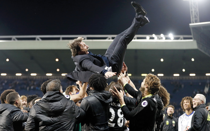 لاعبو تشلسي يحتفلون مع مدربهم كونتي بلقب إنجلترا. رويترز