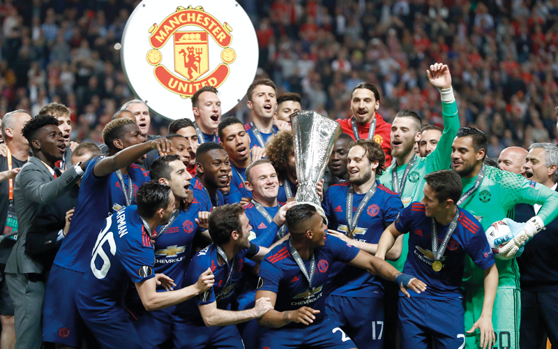 من احتفال مان يونايتد بلقب الدوري الأوروبي الأسبوع الماضي. أ.ف.ب
