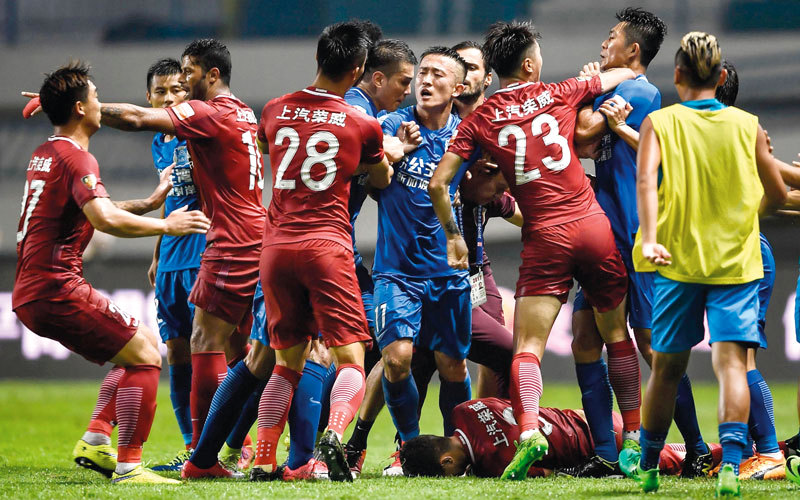 لحظة العراك بين لاعبي شنغهاي سيبغ وغوانجو آر اف وبينهم أوسكار. أ.ف.ب