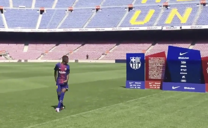 أثار الظهور الأول للنجم الفرنسي عثمان ديمبلي المنتقل إلى برشلونة الإسباني مقابل 105 مليون يورو سخرية خصوم الفريق الكاتالوني باستعراض خارج التغطية خلال تقديمه رسمياً، اليوم، لأنصار "البلوغرانا"، إذ ظهر ديمبلي متلعثماً بالكرة بشكل لا يتناسب مع عقده.