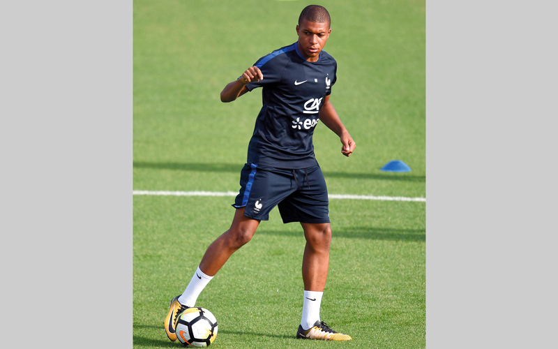 مبابي في تدريبات منتخب فرنسا أمس. أ.ف.ب