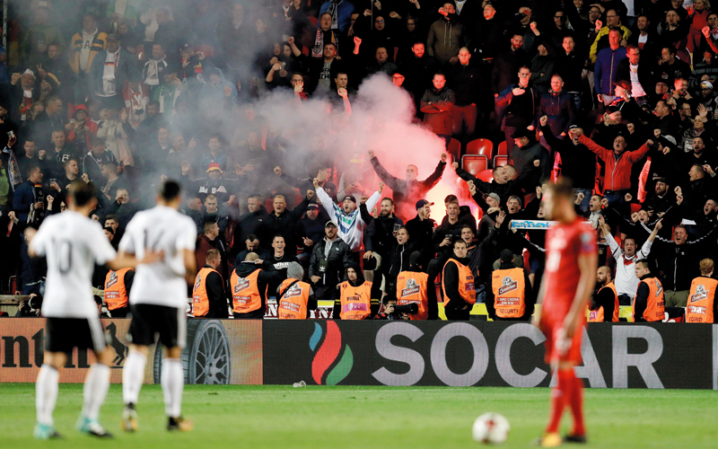 مشجعون ألمان أثاروا الجدل خلال مباراة الماكينات والتشيك. رويترز