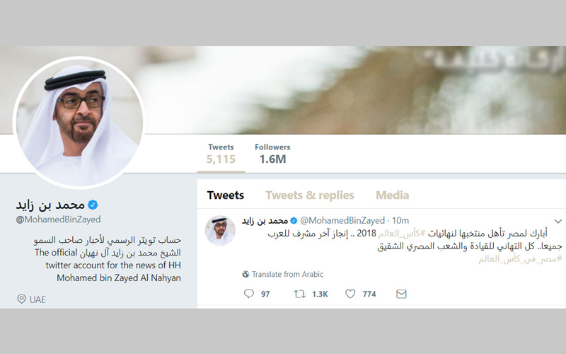 بارك صاحب السمو الشيخ محمد بن زايد آل نهيان، ولي عهد أبوظبي نائب القائد الأعلى للقوات المسلحة، لجمهورية مصر العربية، تأهل المنتخب الأول لكرة القدم إلى كأس العالم 2018 في روسيا.