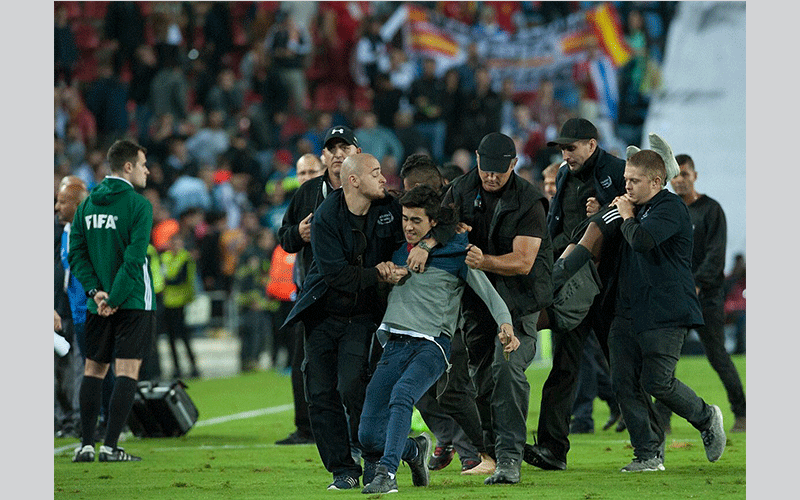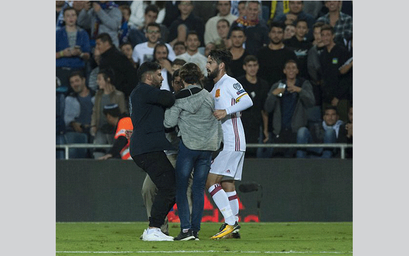 أوقفت الشرطة 6 مشجعين إسرائيليين اقتحموا الملعب عقب انتهاء مباراة الجولة العاشرة من تصفيات اوروبا المؤهلة لمونديال كأس العالم روسيا 2018، وتوجهوا إلى لاعب وسط ريال مدريد، إيسكو وحاولوا الاعتداء عليه، وكان أحدهم يمسك سكينا في يده محاولا اغتيال نجم الفريق الملكي. وذلك في المباراة التي أقيمت أمس الاثنين بين منتخب إسبانيا ونظيره الإسرائيلي، بحسب ما ذكرت صحيفة "سبورت" الإسبانية.