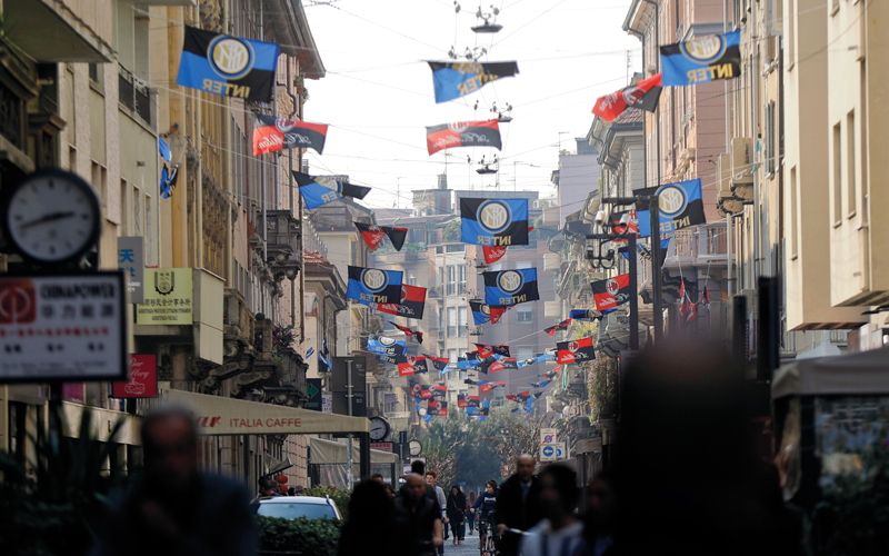 أعلام ميلان والإنتر ترفرف في شوارع الحي الصيني بمدينة ميلانو قبل «ديربي الغضب». أ.ب