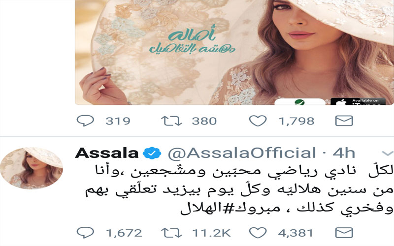 وقالت أصالة نصري في تغريدة على حسابها في موقع التواصل الاجتماعي "تويتر"، الثلاثاء، عقب انتهاء المباراة: "لكل نادي رياضي محبين ومشجعين، وأنا من سنين هلالية، وكل يوم يزداد تعلّقي بهم وفخري كذلك، مبروك الهلال".