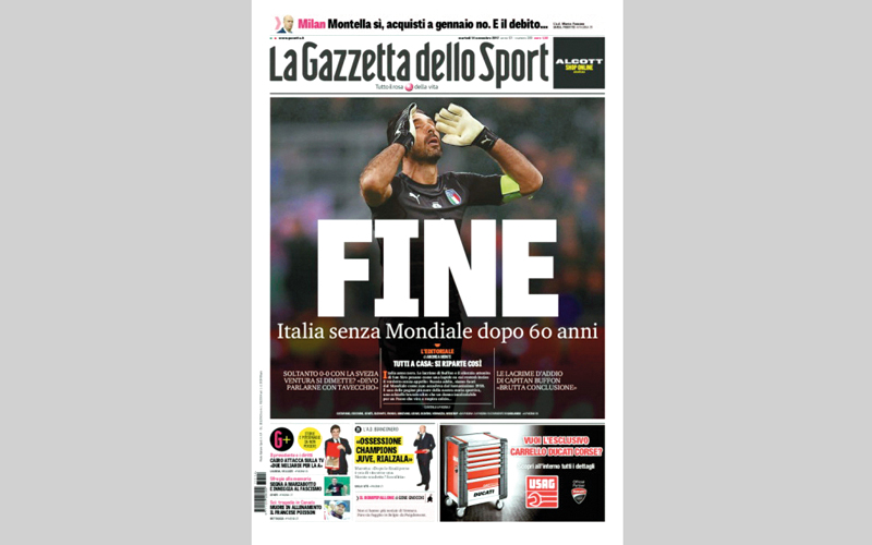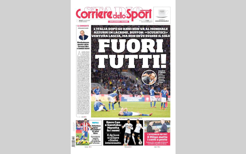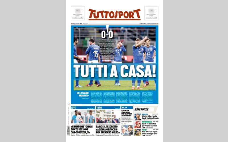 من جانبها، جمعت صحيفة «لا ريبوبليكا» عبارات عدة في عنوان واحد «خسارة الآزوري، المونديال من دون إيطاليا. دموع بوفون: لقد فشلنا». وذهبت صحيفة «توتوسبورت» الرياضية التي تصدر في مدينة تورينو الى أبعد من ذلك، وكتبت «ايطاليا لن تذهب الى المونديال لأنها لا تستحق ذلك. الاهانة لا تطال فقط (جانبييرو) فينتورا الذي لن يكون مدرباً للمنتخب بعد اليوم، وإنما منظومة الكرة».