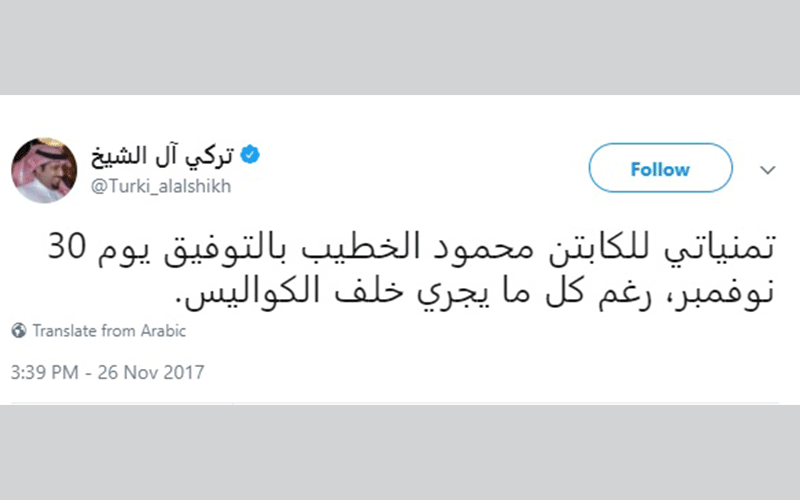 وقال رئيس أكبر هيئة رياضية في المملكة في تغريده على حسابه على موقع التواصل الاجتماعي "تويتر": "تمنياتي للكابتن محمود الخطيب بالتوفيق يوم 30 نوفمبر، رغم كل ما يجري خلف الكواليس".