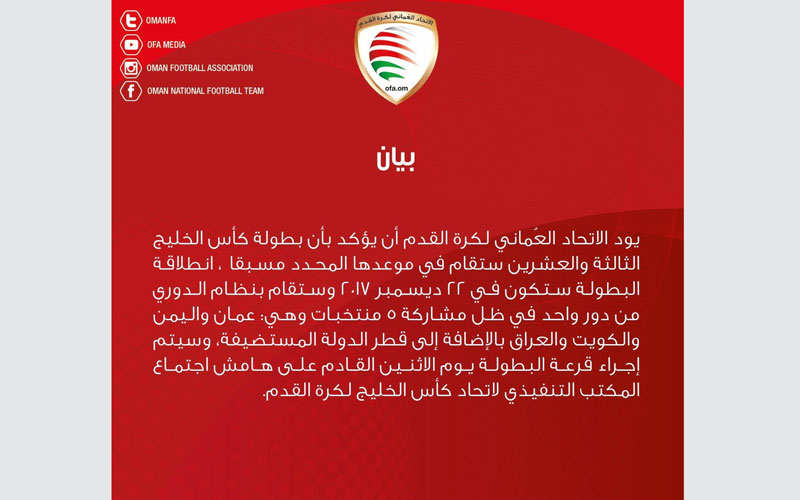 اصدر الاتحاد العُماني لكرة القدم بيانا صحافيا على موقعه الرسمي أعلن من خلال إقامة بطولة الخليج رقم 23 في موعدها يوم 22 ديسمبر الحالي بمشاركة 5 منتخبات هي العراق وعمان والكويت واليمن اضافة الى البلد المستضيف قطر، وأوضح البيان ان نظام البطولة سيكون بنظام الدوري من دور واحد في ظل مشاركة 5 منتخبات، وحدد البيان يوم الأثنين القادم موعدا لإجراء قرعة البطولة على هامش اجتماع المكتب التنفيذي لاتحاد كأس الخليج لكرة القدم.
