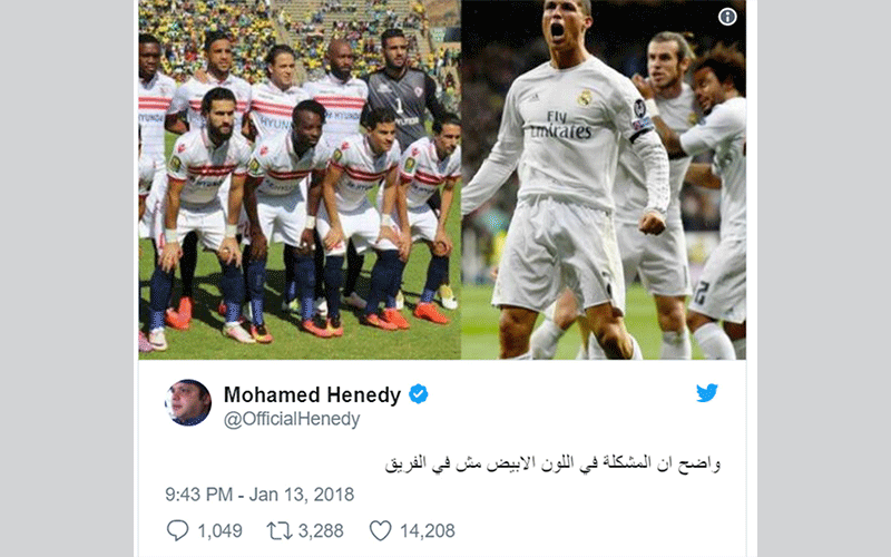 ونشر هنيدي تغريدة وضع بها صورة الفريقين، وعلق قائلاً: "واضح أن المشكلة في اللون الابيض مش في الفريق".