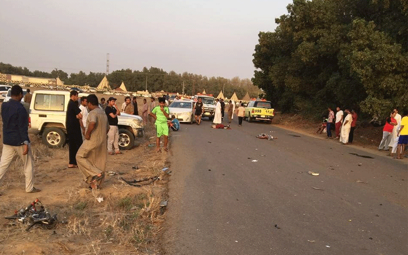وأوضح الناطق الإعلامي لشرطة منطقة جازان النقيب نايف بن عبد الرحمن الحكمي أن مركبة من نوع بك اب غمارتين بقيادة شاب (غير مؤهل للقيادة) اصطدمت بمجموعة من أعضاء نادي اليرموك الرياضي للدراجات وعددهم 17 أثناء قيامهم بأداء تمرين بطريق زراعي وتفاجأ بهم قائد المركبة لوجود منحنى بالإضافة لكثافة الأشجار بالطريق ما نتج عنه وفاة أربعة من الدراجين بالموقع وإصابة البقية أربعة منهم إصابتهم بليغة تم اسعافهم عن طريق الهلال الاحمر الى المستشفيات القريبة.