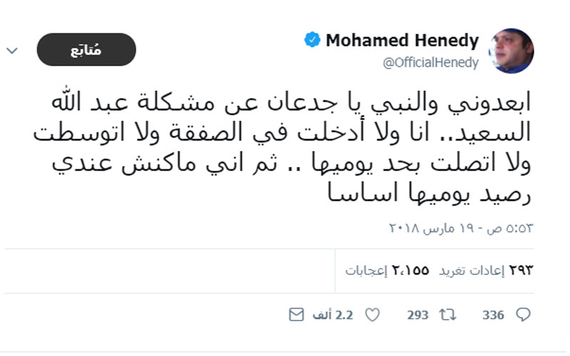 محمد هنيدي: لم أتدخل في صفقة عبد الله السعيد "ما كنش معايا رصيد"