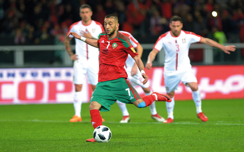 زياش سجل الهدف الأول للمغرب من ركلة جزاء.. وصنع الثاني أمام صربيا. رويترز