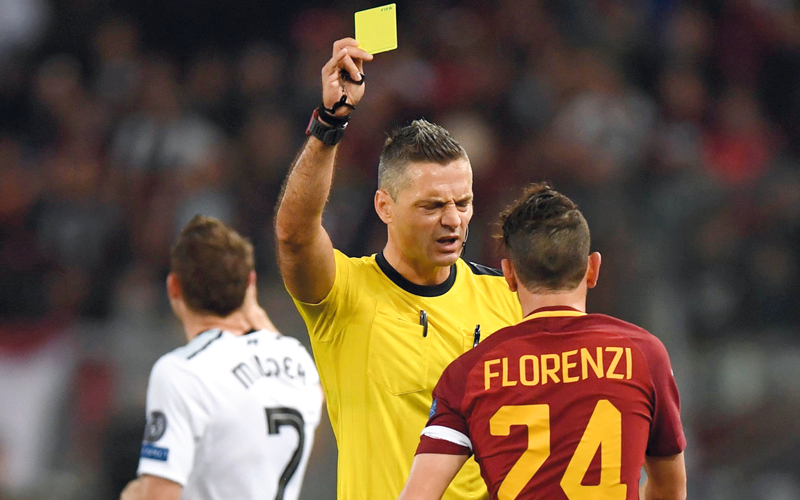 لاعب روما لورنزي خلال تلقيه بطاقة صفراء. أ.ف.ب