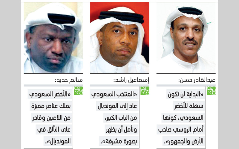 وطالبوا في حديث لـ«الإمارات اليوم» لاعبي المنتخب السعودي بأن يعطوا كل ما عندهم في المستطيل الأخضر، وإثبات جدارتهم، وإظهار إمكاناتهم الفنية العالية، وتسويق أنفسهم كروياً في أهم وأكبر حدث كروي على مستوى العالم.