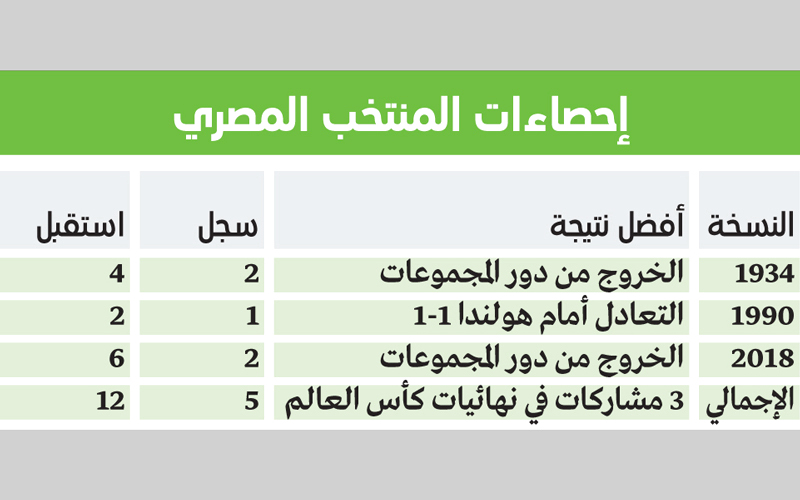 سجل المنتخب المصري، في مونديال روسيا مشاركته الثالثة في نهائيات كأس العالم، إلا أن نتائجه تعتبر الأسوأ من الناحيتين الهجومية والدفاعية، خصوصاً أن الظهور الأول للفراعنة في البطولة كان في 1934، في بطولة ودعها المصريون بخسارتهم أمام المجر بنتيجة «2-4»، قبل أن تحمل المشاركة الثانية عنوان الظهور المشرف، حينما عاد الفراعنة عام 1990 إلى المشاركة في بطولة استهلها الفراعنة بالتعادل مع هولندا «1-1»، ثم التعادل السلبي مع إيرلندا، والخسارة في المباراة الثالثة أمام إنجلترا بهدف نظيف، لتحمل المشاركة الثالثة في 2018، وعلى الرغم من تسلح المصريين بخبرات أفضل لاعبي الدوري الإنجليزي ونجم نادي ليفربول محمد صلاح، تلقوا ثلاث هزائم أولاها أمام الأوروغواي «صفر-1»، وأمام روسيا «1-3»، وآخرها من السعودية «1-2».