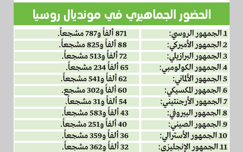 كشفت صحيفة «ذا صن» البريطانية عن هيمنة جماهير روسيا وأميركا والبرازيل، على قائمة الأكثر حضوراً في مدرجات مونديال 2018 بروسيا، الذي استهلّ، أمس، دوره الربع نهائي ويسدل الستار عنه في 14 يوليو الجاري.