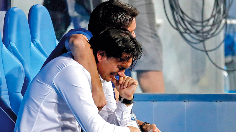 زلاتكو يبكي فرحاً بعد تأهل كرواتيا لنصف نهائي المونديال.. وأحد مساعديه يشد من أزره. إي.بي.إيه