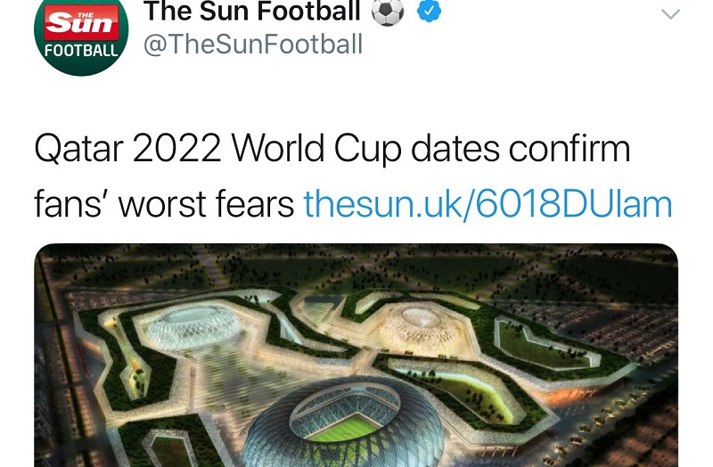 أكدت صحيفة ذا صن الانجليزية أن مخاوف المشجعين حول العالم تحققت بعد أعلان الاتحاد الدولي لكرة القدم "فيفا" رسمياً اقامة مونديال 2022 في الفترة من 21/نوفمبر حتى 18/ ديسمبر.