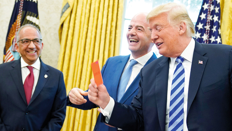 حيّا الرئيس الأميركي، دونالد ترامب، تصويت الدول الأعضاء في الاتحاد الدولي لكرة القدم (فيفا)، على منح الملف المشترك بين الولايات المتحدة وكندا والمكسيك تنظيم مونديال 2026، مستفيداً من استقباله لرئيس الاتحاد، جاني إنفانتينو، لرفع بطاقة حمراء في وجه الصحافيين. وقال ترامب من المكتب البيضاوي في البيت الأبيض: «أنا سعيد جداً لأننا فزنا بتنظيم هذا الحدث المهم، ربما أكبر حدث رياضي في العالم»، مشيراً إلى شغف نجله بارون (12 عاماً) بكرة القدم.
