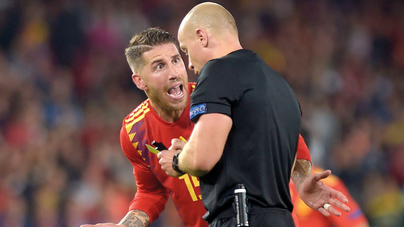 راموس يتجادل مع الحكم بسبب عدم احتساب ركلة جزاء لإسبانيا. أ.ف.ب