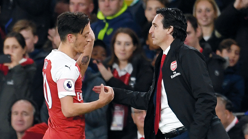 إيمري يحيي نجمه مسعود أوزيل بعد المباراة. إي.بي.إي