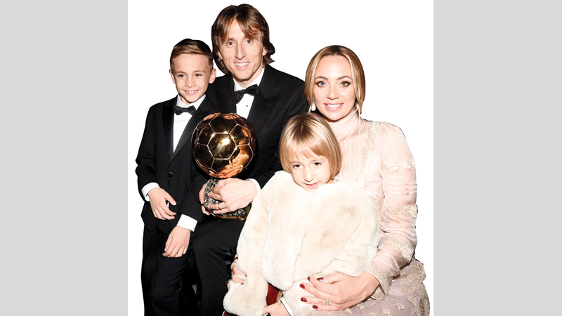 مودريتش مع عائلته الصغيرة خلال التتويج بالكرة الذهبية. أ.ف.ب