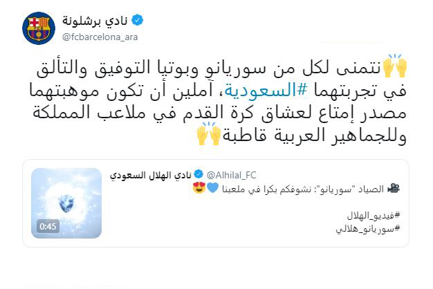 وغرد النادي الاسباني عبر حسابه على تويتر قائلاً: "نتمنى لكل من سوريانو وبوتيا التوفيق والتألق في تجربتهما السعودية، آملين أن تكون موهبتهما مصدر أنواع لعشاق كرة القدم في ملاعب المملكة والجماهير العربية قاطبة".