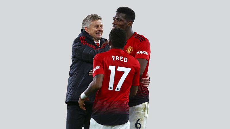 بوغبا وفريد يهنئان سولسكاير على الفوز الكبير للمان يونايتد. أ.ف.ب