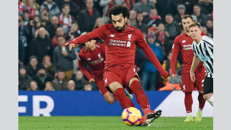 صلاح اتُّهم بالتمثيل في ركلة الجزاء التي سجل منها في نيوكاسل أول من أمس. أ.ف.ب