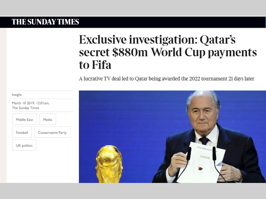 كشفت صحيفة صنداي تايمز عن امتلاكها وثائق مسربة توضح قيام قطر بدفع 880 مليون دولار سراً للاتحاد الدولي لكرة القدم، قبل 21 يوماً من التصويت على حق استضافة كأس العالم 2022، لافتة إلى أن هذه الوثائق ستضاف إلى قائمة طويلة من المعاملات القطرية المريبة التي أحاطت بفوز الدوحة باستضافة مونديال العالم 2022.