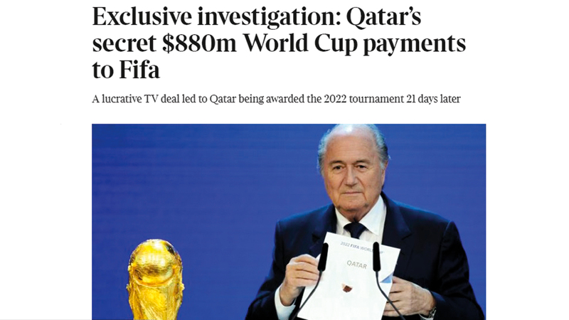 كشفت صحيفة «صنداي تايمز» البريطانية عن امتلاكها وثائق مسربة، توضح قيام قطر بدفع 880 مليون دولار سراً للاتحاد الدولي لكرة القدم «فيفا»، قبل 21 يوماً من التصويت على حق استضافة كأس العالم 2022، مشيرة إلى أن هذه الوثائق ستضاف إلى قائمة طويلة من المعاملات القطرية المريبة، التي أحاطت بفوز الدوحة باستضافة مونديال العالم 2022.