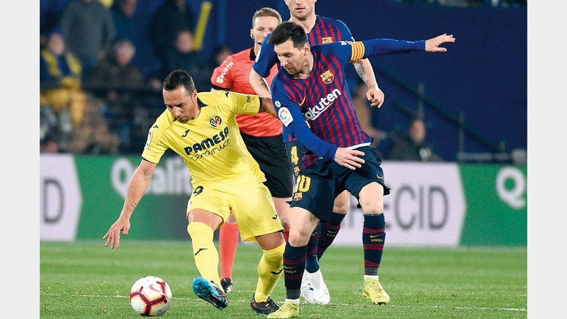 سانتي كازورلا في صراع على الكرة مع ليونيل ميسي. أ.ف.ب
