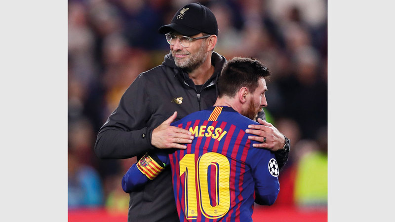كلوب يحيي ميسي في نهاية المباراة. أ.ب