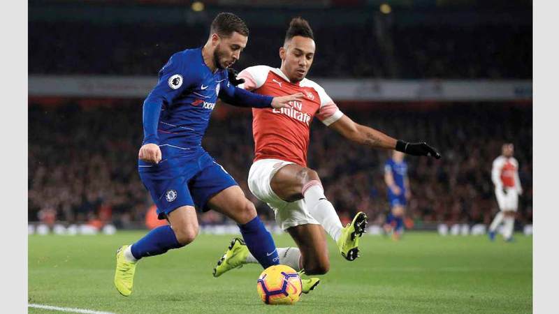 هازار في صراع على الكرة مع هداف أرسنال الغابوني أوباميانغ. أرشيفية