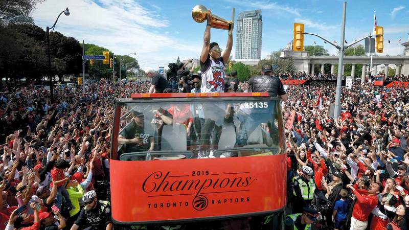 احتشد مئات الآلاف في مختلف أنحاء مدينة تورونتو الكندية أول من أمس، احتفالاً بفريقها رابتورز الذي توج الأسبوع الماضي بلقب دوري كرة السلة الأميركي للمحترفين للمرة الأولى في تاريخه، لكن إطلاق نار عكر هذه الاحتفالات دون أن يوقفها.