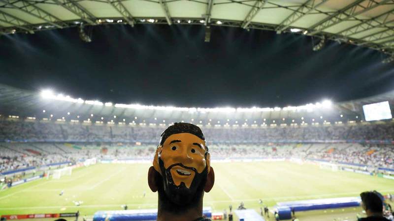 مشجع يضع قناع ميسي على رأسه خلال متابعته مباراة الأرجنتين وباراغواي. أ.ب