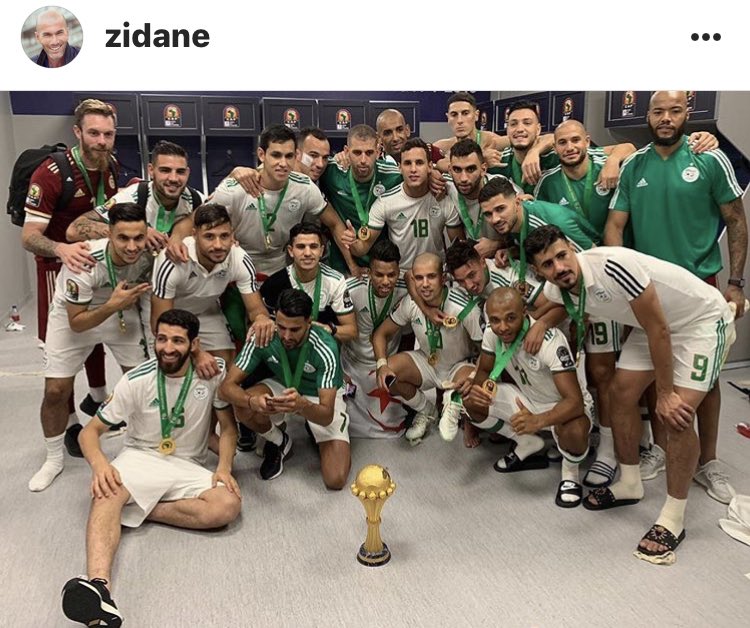 حرص مدرب فريق ريال مدريد، الفرنسي زين الدين زيدان، الجزائري الأصل على تهنئة منتخب الجزائر بالفوز بلقب دوري أبطال إفريقيا 2019، حيث حرص على نشر صورة المنتخب الجزائري على حاسبه الرسمي على موقع التواصل الإجتماعي إنستغرام، وقال رسالة مؤثرة تذكر خلالها شقيقه الأكبر الذي توفى منذ أيام قليلة.