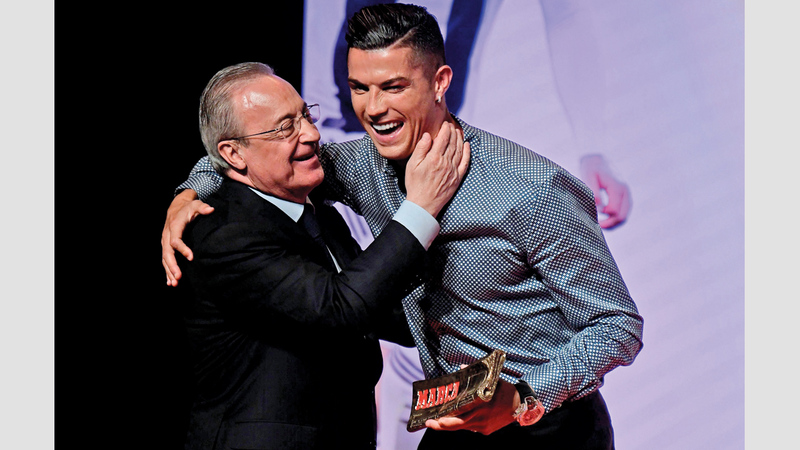 رونالدو التقى رئيس ريال مدريد فلورنتينو بيريز خلال حفل التكريم. أ.ف.ب