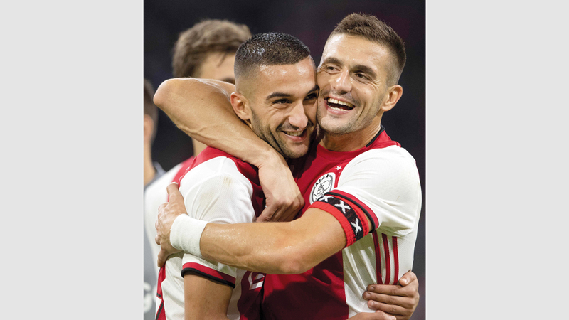 نجما أياكس حكيم زياش وتاديتش يحتفلان بالفوز. أ.ف.ب